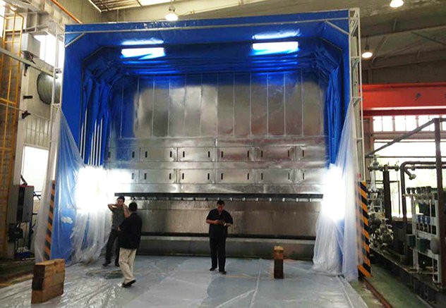 在噴漆房不移動(dòng)一端安裝有水簾式噴漆柜,噴漆產(chǎn)生的漆霧通過水簾凈化或排放到車間外部,漆霧由水過濾或回到水池中,定期清除。